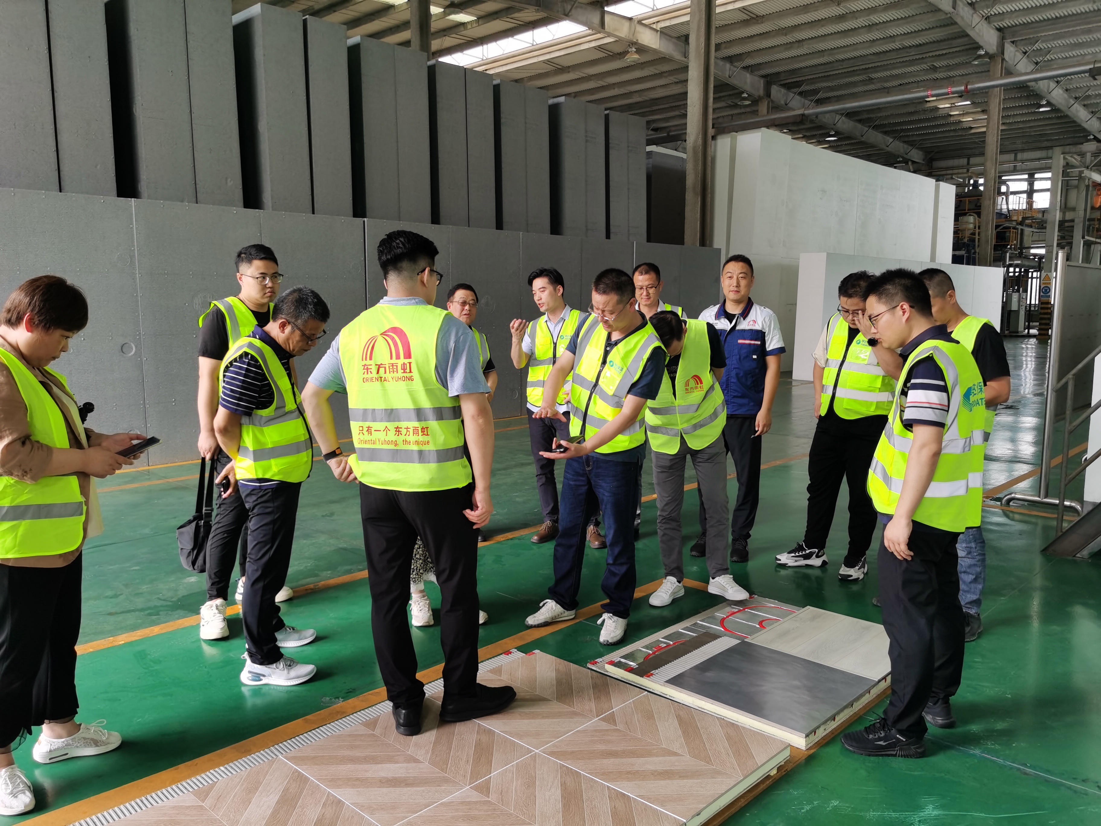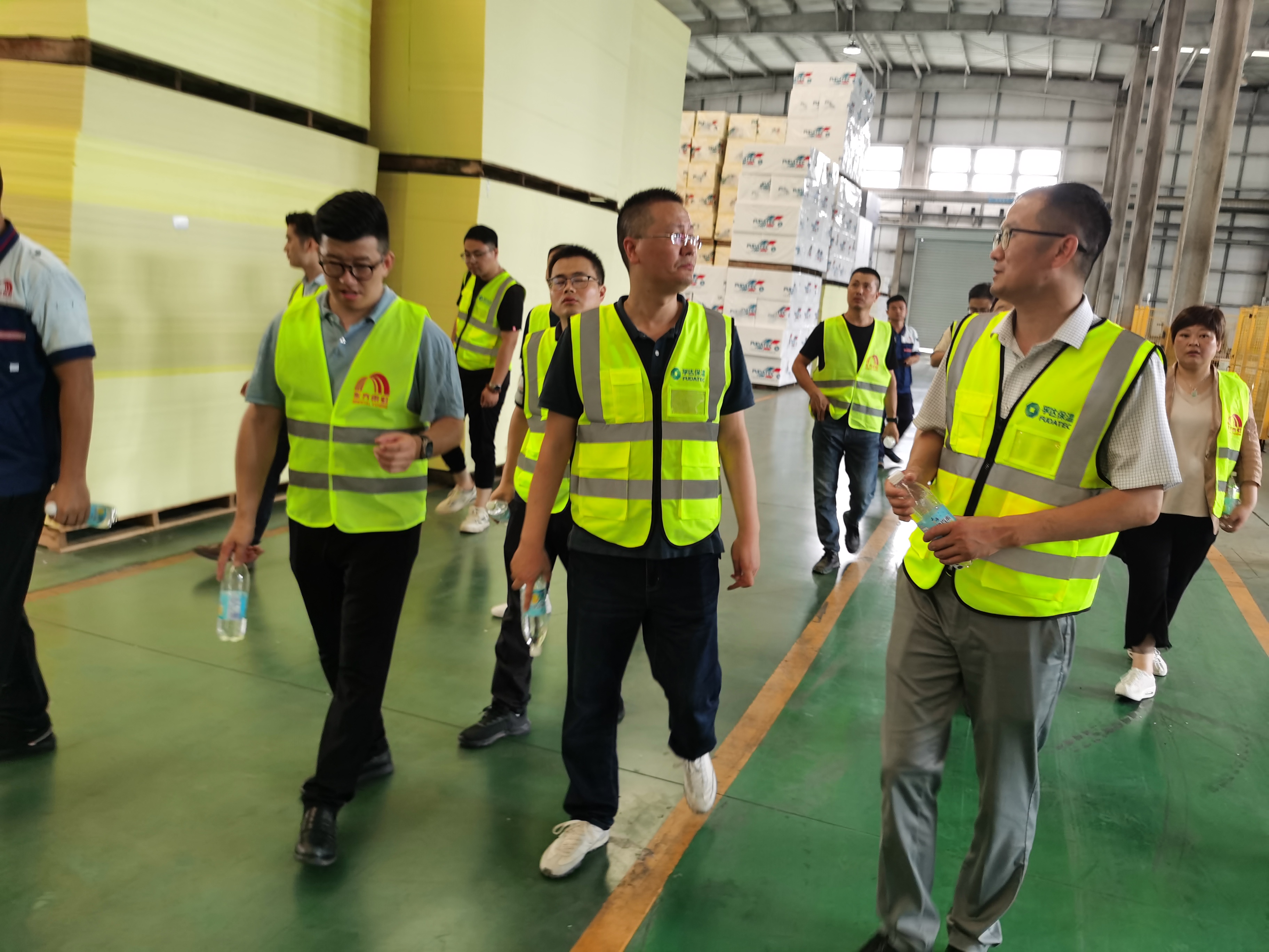 一行嘉宾首先参观了芜湖工厂XPS、EPS、干式地暖、保温隔声装饰楼地面一体砖、高强度保温装饰屋面一体砖等核心产品生产车间,了解各产品生产工艺、原材料及品控等情况,其中重点参观调研干式地暖、保温隔声装饰楼地面一体砖、高强度保温装饰屋面一体砖等装配式建筑相关新产品,并了解相关产品施工工艺及市场应用情况,对孚达公司产品创新力及技术发展方向表示赞同,并对产品生产全过程坚持低碳环保理念给予肯定。