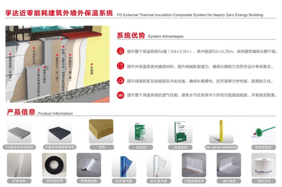 孚达公司FD近零能耗建筑外墙外保温系统,凭借系统中优质的配套材料及系统整体优异保温隔热性、长期耐久性及系统整体抗冲击性等诸多优势已经成功应用于中国建筑科学研究院有限公司建筑环境与能源研究院“十三五”国家课题示范研究项目,系统应用成熟,已参与国内多个大型超低能耗项目,如西安高新天谷雅舍、石家庄利航观棠等。